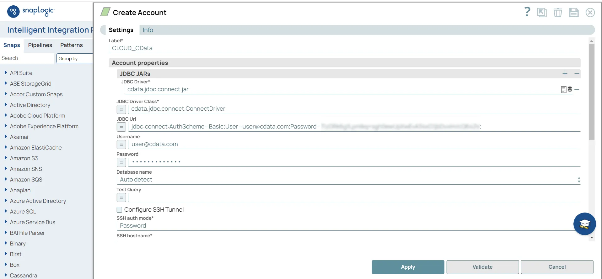 After copying the JDBC CData Connect Cloud JAR file, you will need to paste it into the SnapLogic installation location and configure the connection to Connect Cloud.