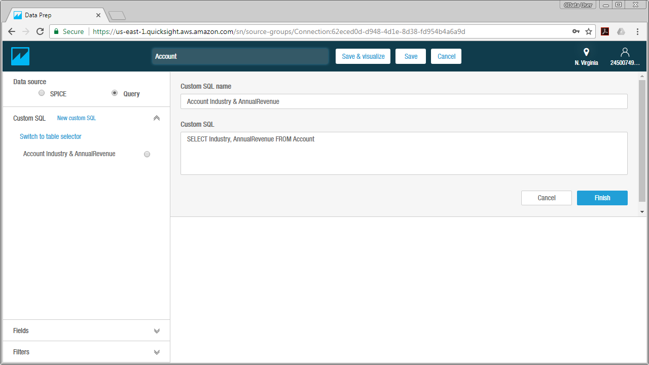 - If you wish to import your data into QuickSight SPICE, click the SPICE option, otherwise QuickSight will query the data directly.