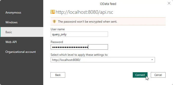 In the OData feed connection, set the URL property to the OData Endpoint URL previously copied and click OK (e.g. "http://localhost:8080/api.rsc"):
