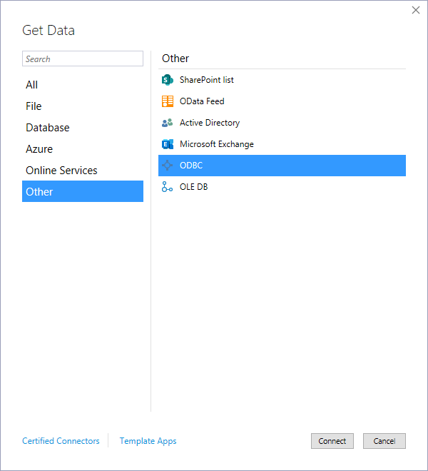 - Select "ODBC" from the Other tab and click "Connect"