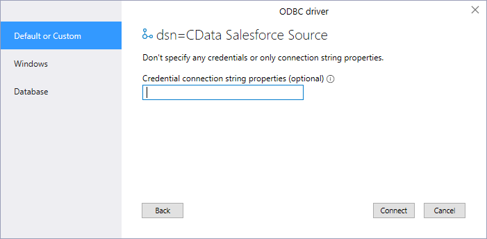If you have not already, first specify connection properties in an ODBC DSN (data source name). This is the last step of the driver installation. You can use the Microsoft ODBC Data Source Administrator to create and configure ODBC DSNs.