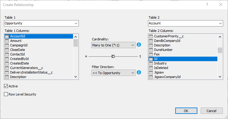 - Select table(s), and choose the foreign keys, cardinality, and filter direction