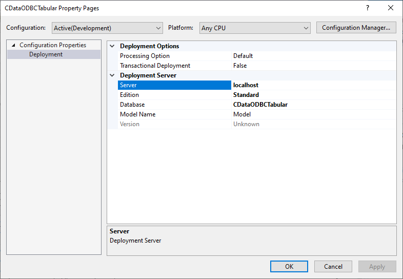 Once you create measures, you are ready to deploy the model. Configure the target server and database by right-clicking the project found in the Solution Explorer and selecting "Properties." Configure the "Deployment Server" properties and click "OK."