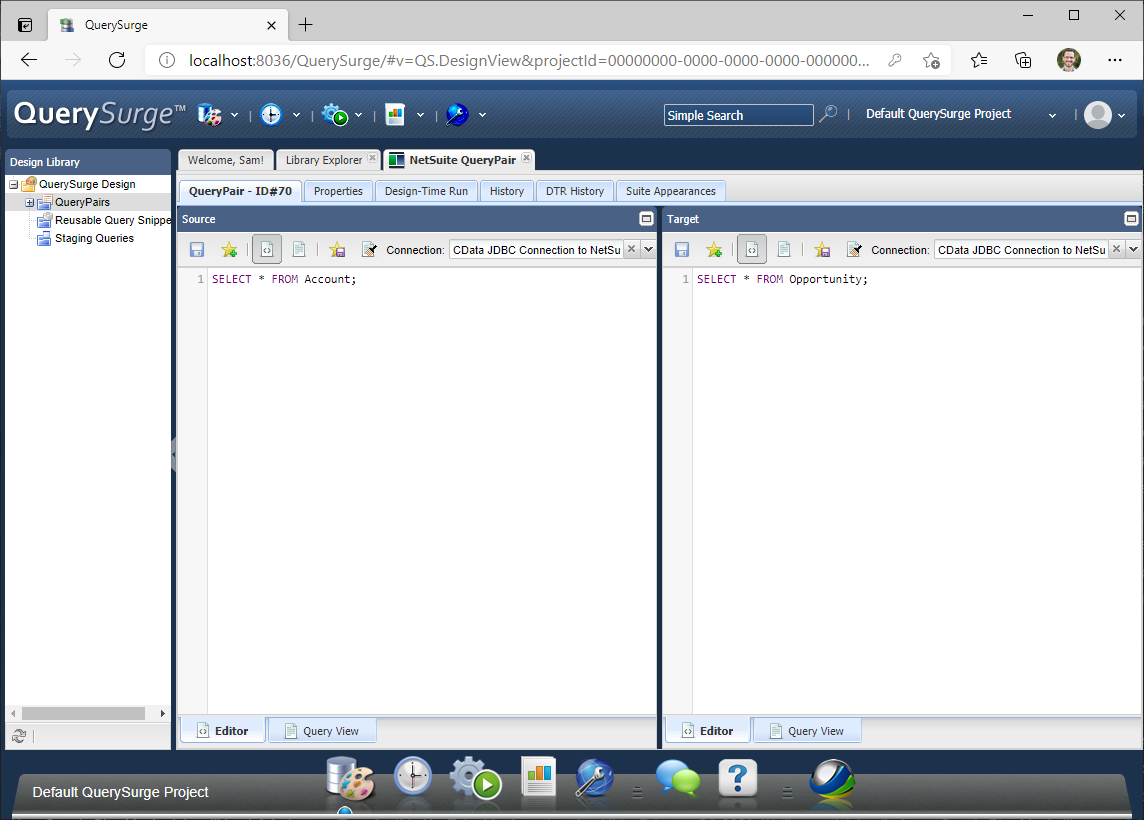 - In either the Source or Target panes, select the connection created above (select the same connection to query CSV twice or another connection to perform a comparison)