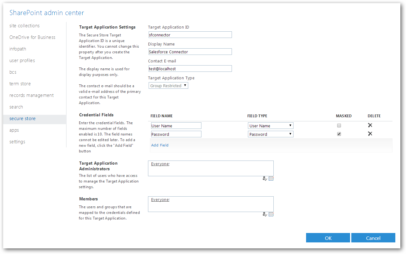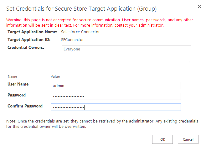 After you create the new secure store target application, follow the procedure below to set the credentials that users in SharePoint will provide when accessing the API Server: