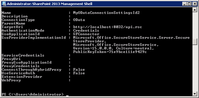 New-SPODataConnectionSetting -AuthenticationMode Credentials -ServiceAddressURL http://my-server/api.rsc -ServiceContext http://myspsite/ -Name MyODataConnectionSettingsId -SecureStoreTargetApplicationId my-target-application-IdThe output below shows that the command has executed successfully: