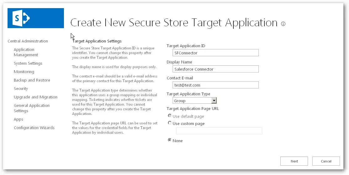Enter the application Id, display name, and contact email to configure the new secure store target application. Set the target