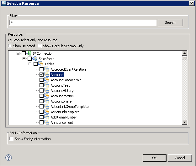 - In the dialog that is displayed, clear the Show Default Schema Only option and expand the node for the ODBC connection. Select the entity that you want.
