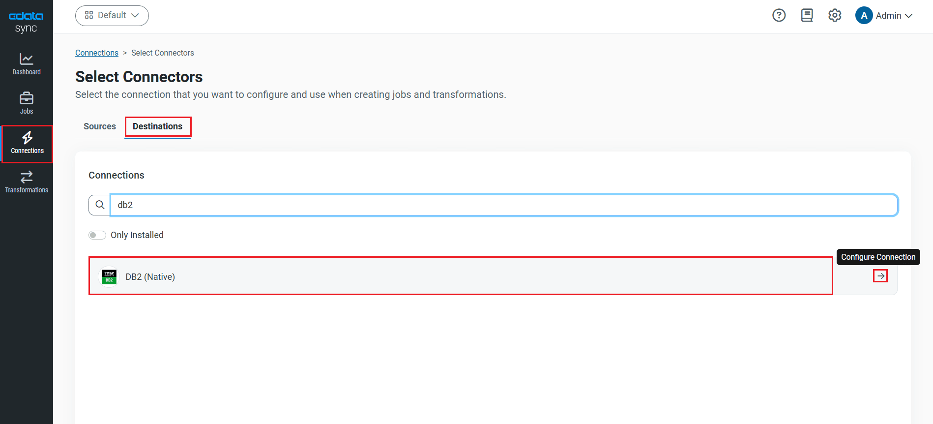 - Select the Destinations tab and locate the IBM DB2 connector.