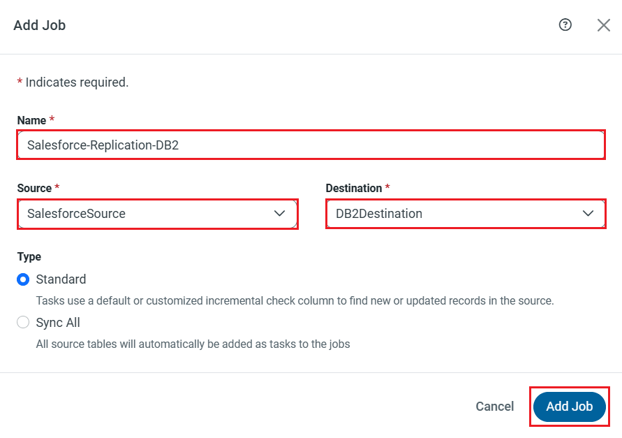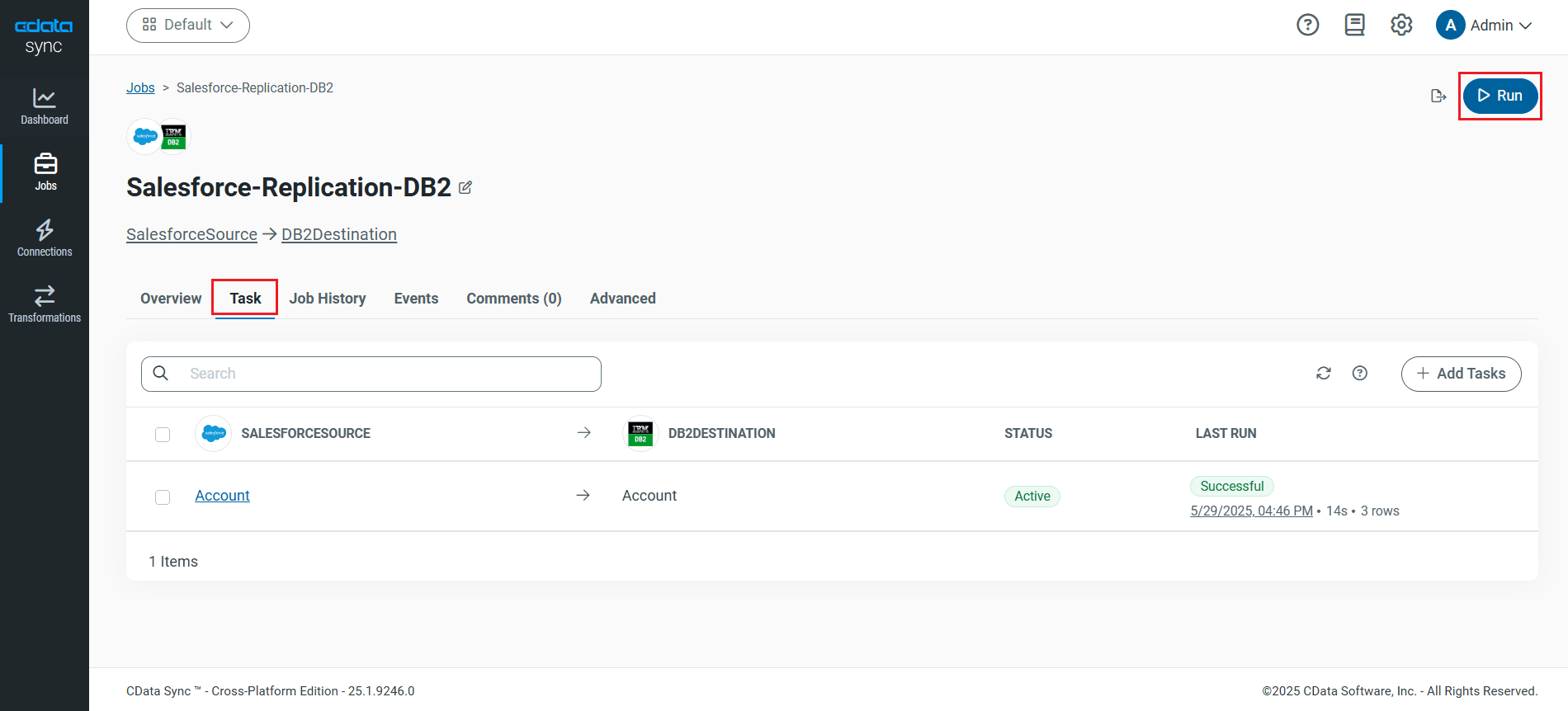 CData Sync enables you to control replication with a point-and-click interface and with SQL queries. For each replication you wish to configure, navigate to the Jobs tab and click Add Job. Select the Source and Destination for your replication.