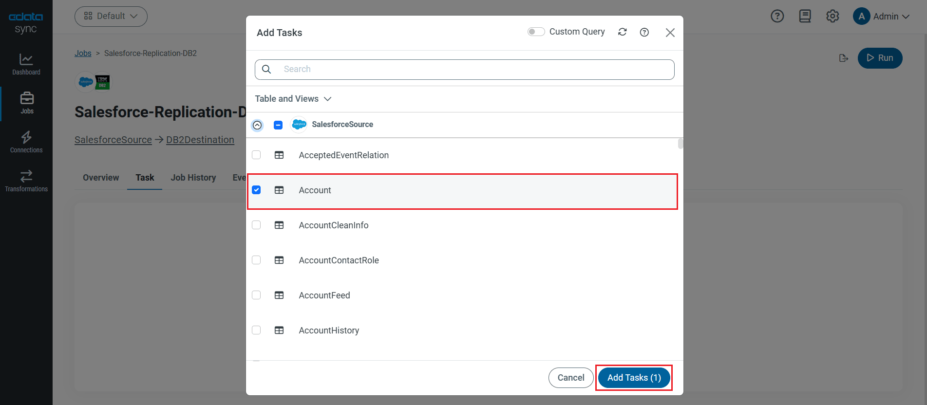 To replicate an entire table, navigate to the Task tab in the Job, click Add Tasks, choose the table(s) from the list of CSV tables you wish to replicate into IBM DB2, and click Add Tasks again.