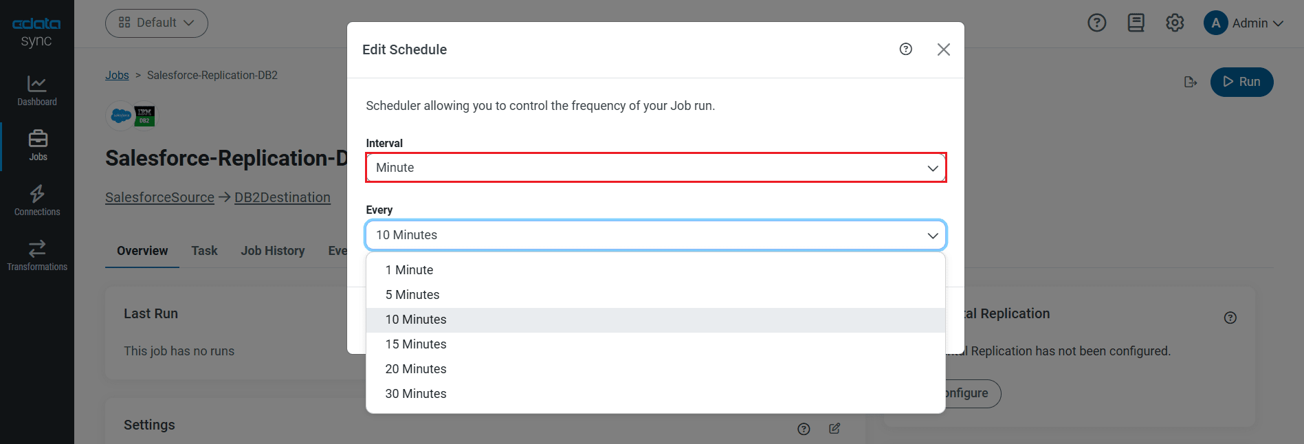 Select the Overview tab in the Job, and click Configure under Schedule. You can schedule a job to run automatically by configuring it to run at specified intervals, ranging from once every 10 minutes to once every month.