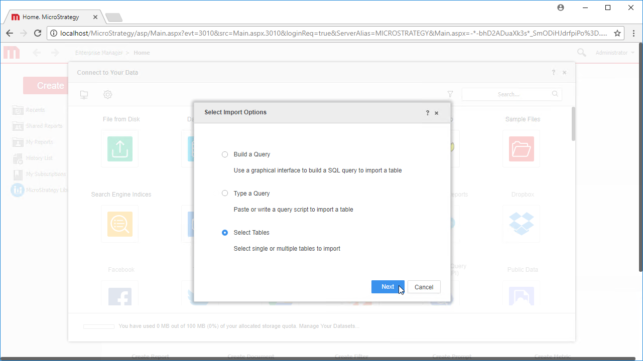 Note: Since we create a live connection, we can import whole tables and utilize the filtering and aggregation features native to the MicroStrategy products to customize our datasets. - Click Finish, choose to the option to connect live, save the query, and choose the option to create a new dossier. Live connections are possible and effective, thanks to high-performance data processing native to CData JDBC drivers.