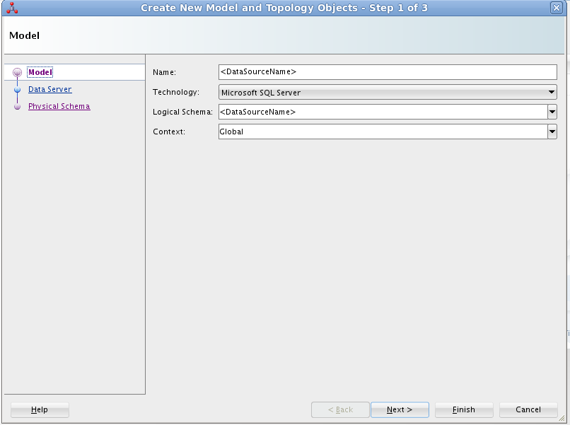 - On the Data Server screen of the resulting dialog, enter the following information: