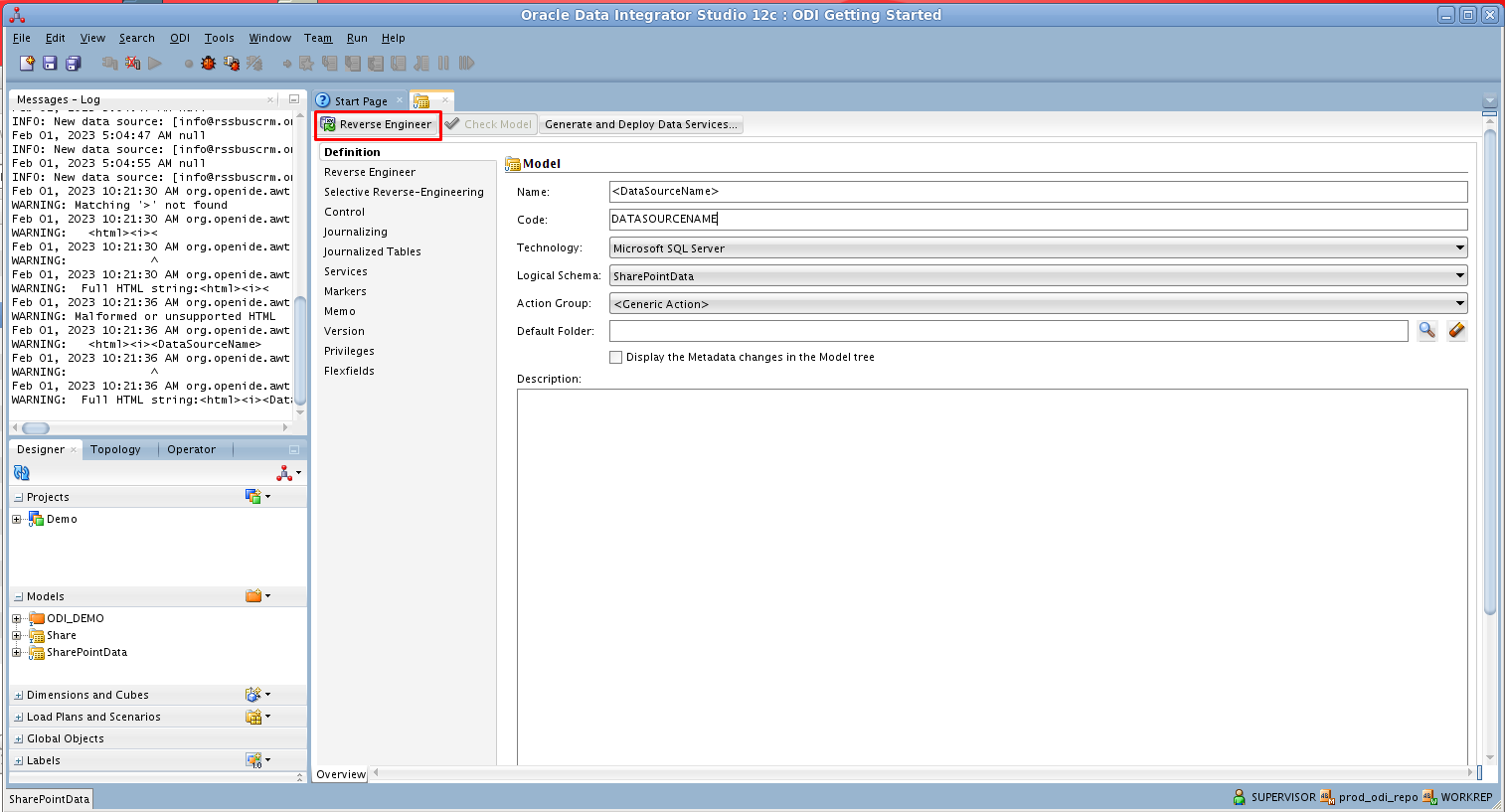 - In ODI expand the Models accordion in the Designer navigator and double-click the Sales Administration node in the ODI_DEMO folder. The model is opened in the Model Editor.