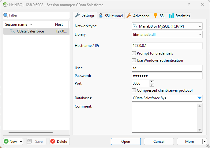 Once you have a MySQL Service configured for the CData ODBC Driver for Databricks, you are ready to connect to the data in HeidiSQL. Start by creating a new connection Session in HeidiSQL, then choose the MySQL library type.