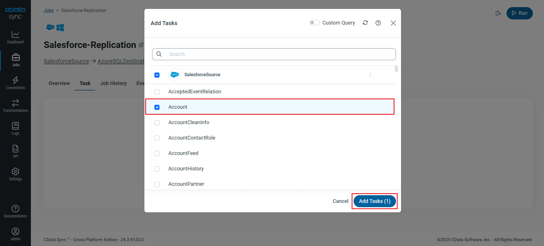 To replicate an entire table, navigate to the Task tab in the Job, click Add Tasks, choose the table(s) from the list of Databricks tables you wish to replicate into Azure SQL database, and click Add Tasks again.