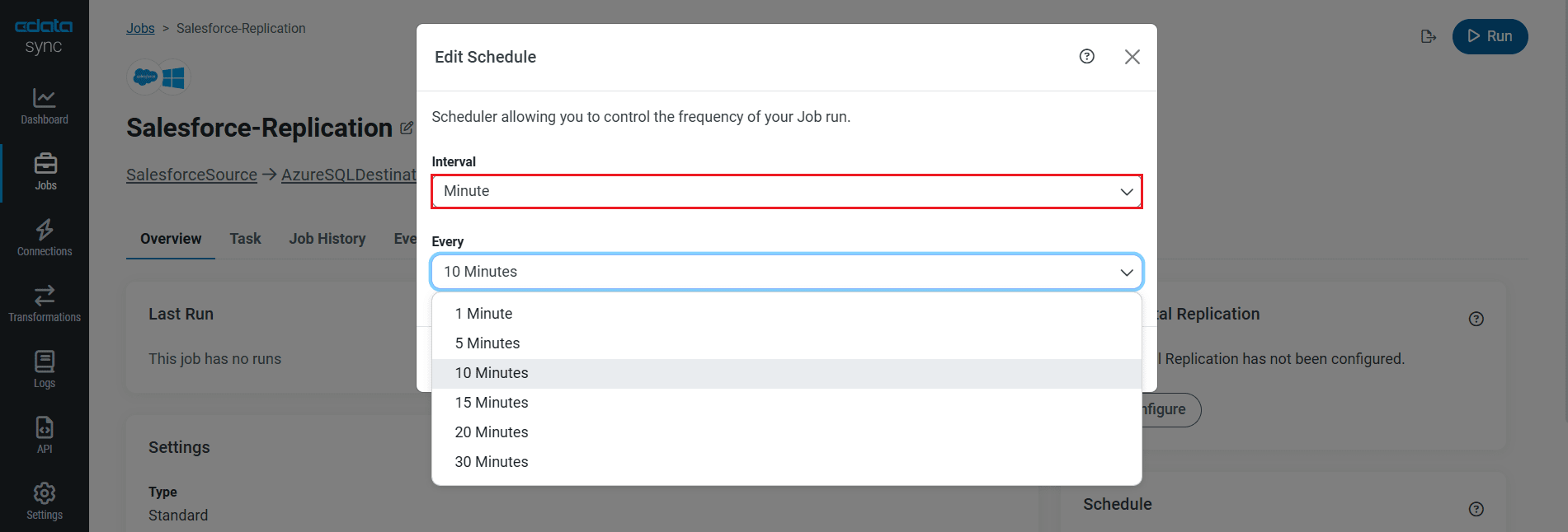 Select the Overview tab in the Job, and click Configure under Schedule. You can schedule a job to run automatically by configuring it to run at specified intervals, ranging from once every 10 minutes to once every month.