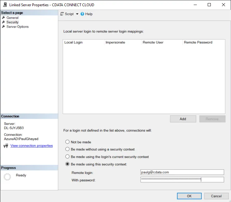 SQL Server Linked Servers enable the SQL Server Database Engine to read data from remote data sources and execute commands against the remote database servers outside of the instance of SQL Server. Typically, linked servers are configured to enable the execution of a T-SQL statement that includes tables in another instance of SQL Server, or another database product such as Oracle. When paired with CData Connect Cloud, linked servers provides instant access to Microsoft Dataverse data from your SQL Server database. This article demonstrates how to connect to Microsoft Dataverse using Connect Cloud and query Microsoft Dataverse data in SQL Server Management Studio (SSMS).