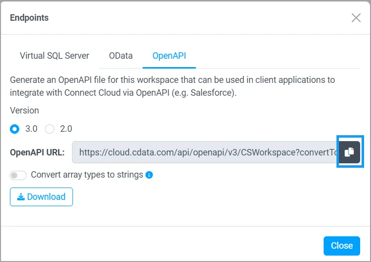 - Make note of the OpenAPI URL or the Virtual SQL Server URL for your workspace, e.g. https://cloud.cdata.com/api/openapi/v3/{workspace_name}...