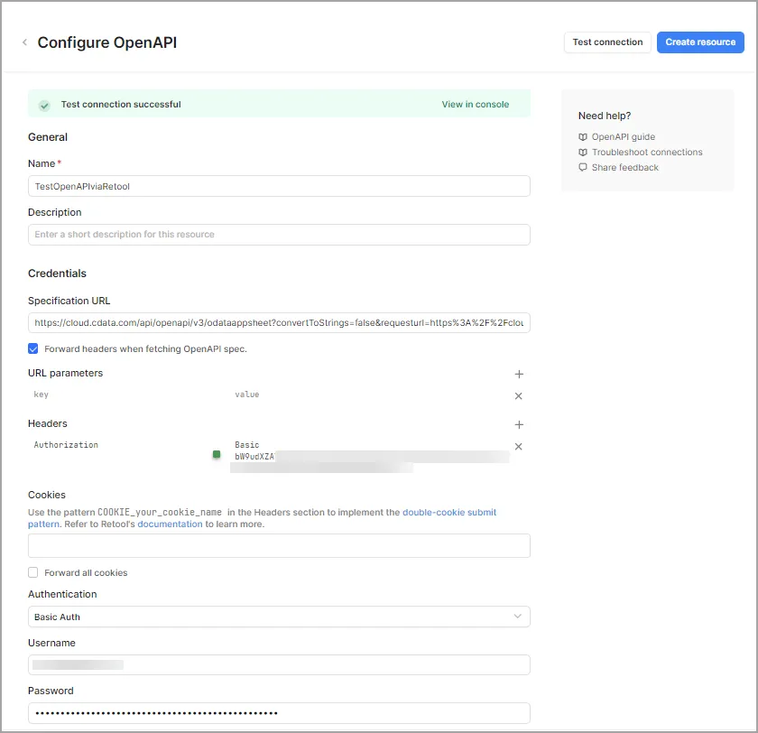 - For the Basic connection value, Retool requires a base64-encoded version of your CData Connect Cloud username:PAT combination (where PAT is the token you generated earlier). Use a tool like this to encode the value. For example, [email protected]:12345 encodes to dGVzdEBjZGF0YS5TIzNDU=. Copy this encoded value and paste it into the value field after Basic with a space.