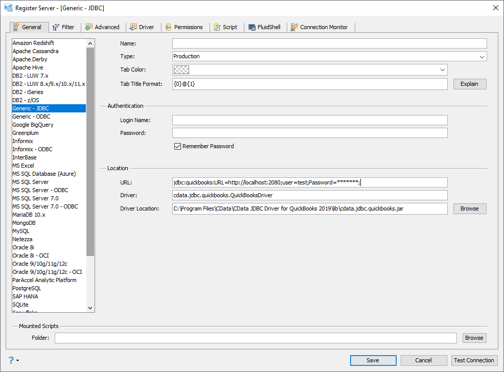 - Driver: Enter the Driver's class name, cdata.jdbc.cds.CDSDriver.