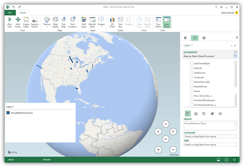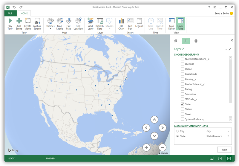 In the Choose Geography menu, Power Map detects the columns that have geographic information. In the Geography and Map Level menu in the Layer Pane, you can select the columns you want to work with. Power Map then plots the data. A dot represents a record that has this value. When you have selected the geographic columns you want, click Next.