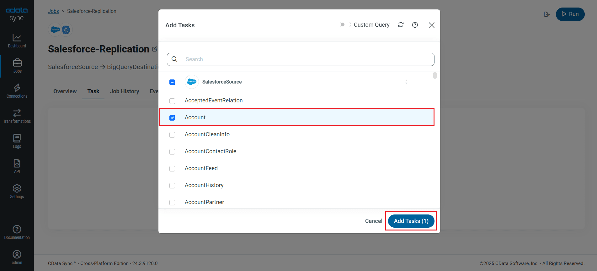 To replicate an entire table, navigate to the Task tab in the Job, click Add Tasks, choose the table(s) from the list of Microsoft Dataverse tables you wish to replicate into Google BigQuery, and click Add Tasks again.