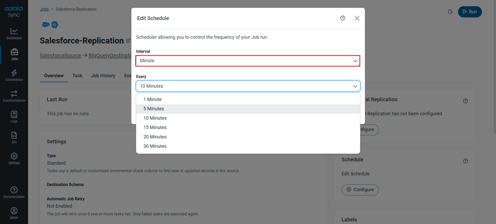 Select the Overview tab in the Job, and click Configure under Schedule. You can schedule a job to run automatically by configuring it to run at specified intervals, ranging from once every 10 minutes to once every month.