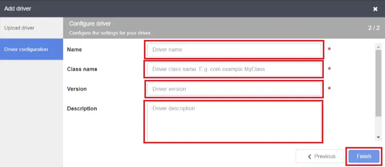 - JDBC driver name: Enter the JDBC driver name to identify the driver configured in Step 6.