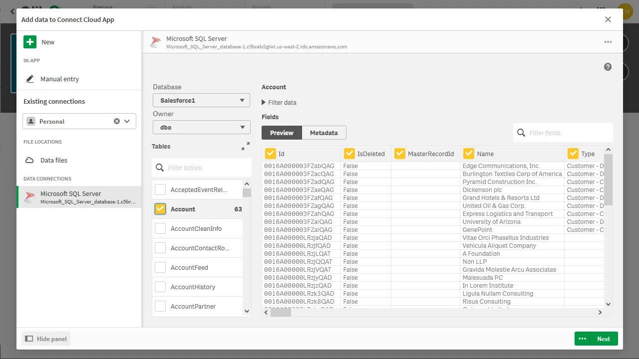 - Click Next, configure the model, and load the data into Qlik Sense.