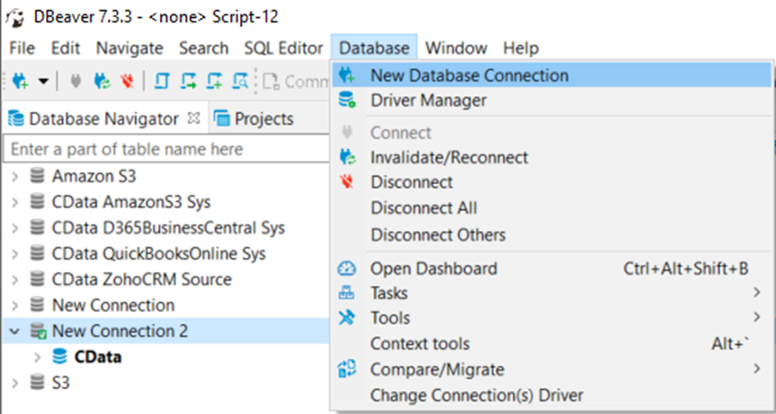 - Open the DBeaver application and in the Database menu, select the New Database Connection option.