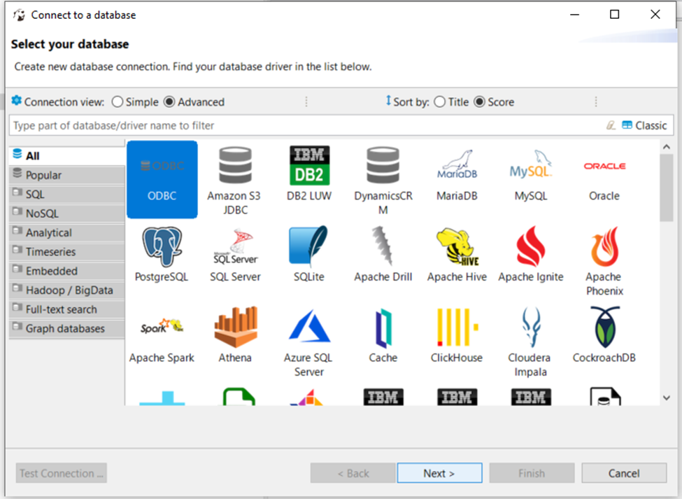 - In the 'Connect to a database' window, select ODBC and click Next.