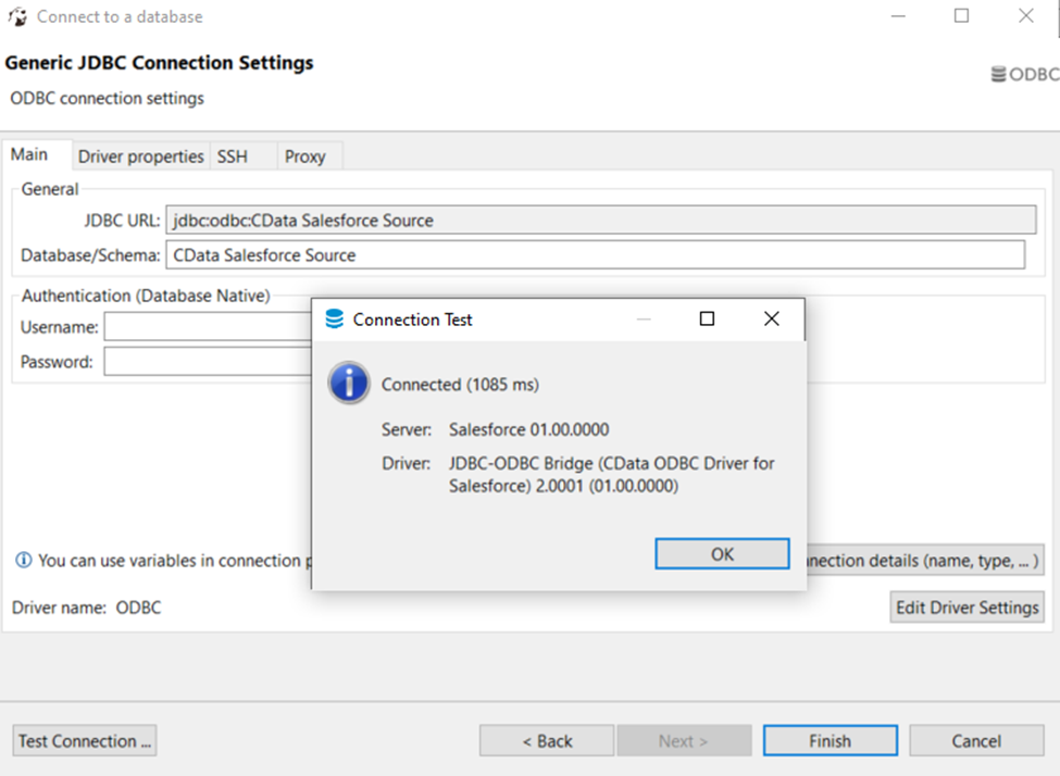 - Click the Test Connection button. You should receive a 'Connected' message after DBeaver has detected the DSN, along with details about the driver if the connection is successful.