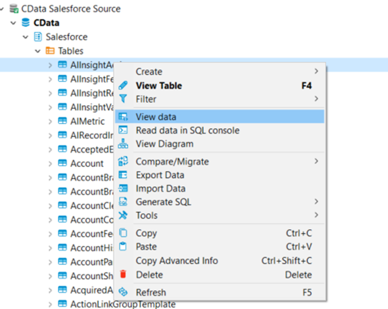 You can now query information from the tables exposed by the data source connection. You can expand the database structure in order to view all the tables. You can retrieve the table's data by right-clicking on a table name and selecting View data. The data will then be available in the Data tab.