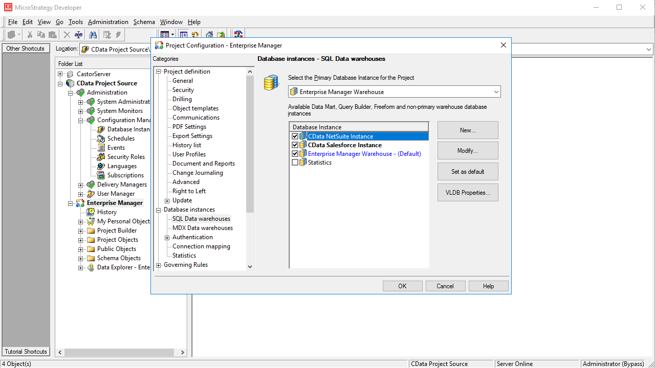 MicroStrategy is an analytics and mobility platform that enables data-driven innovation. When you pair MicroStrategy with the CData ODBC Driver for HCL Domino, you gain database-like access to live HCL Domino data from MicroStrategy, expanding your reporting and analytics capabilities. In this article, we walk through creating a database instance for HCL Domino in MicroStrategy Developer and creating a Warehouse Catalog based on HCL Domino data.
