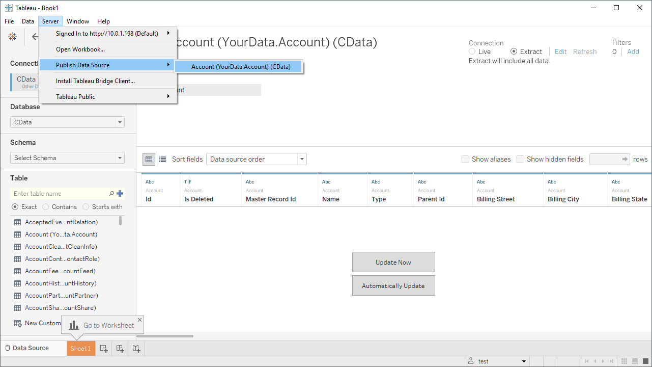 - From the Server menu, click Publish Data Source -> (YOUR DATA SOURCE).
