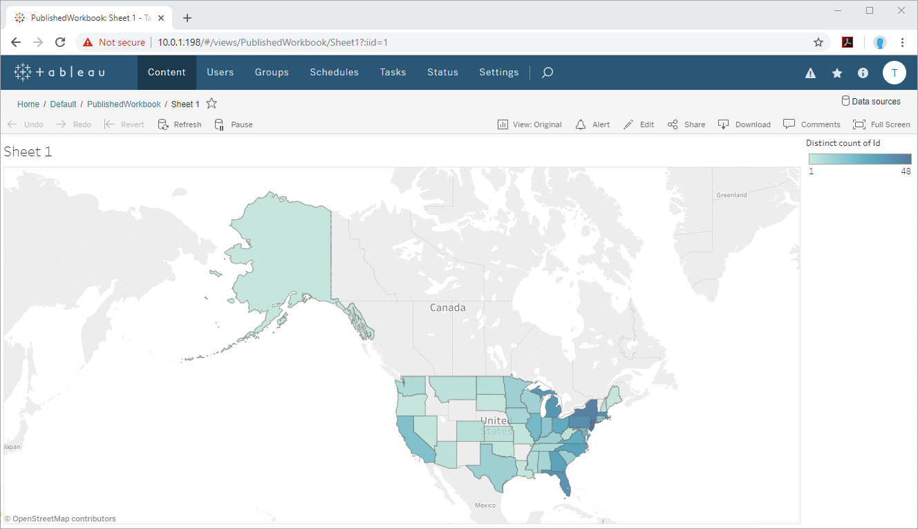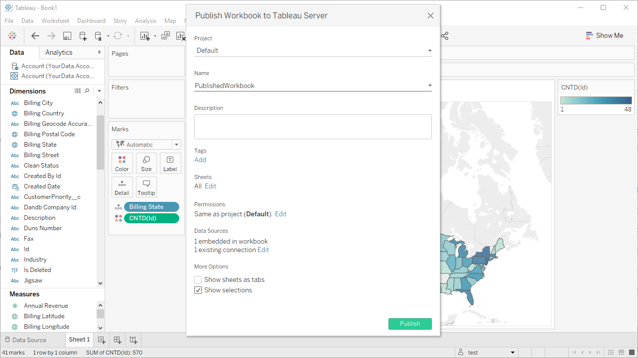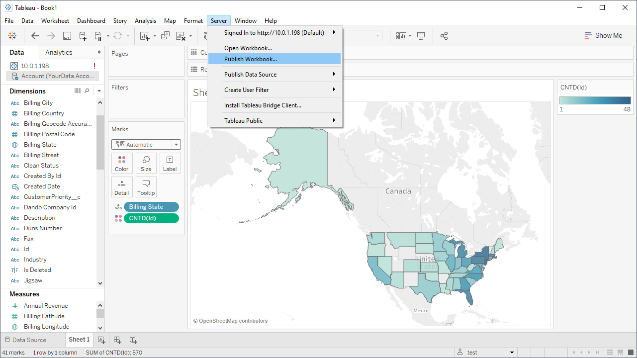 - Once the Workbook is complete, click Server -> Publish Workbook to publish the Workbook to Tableau Server.