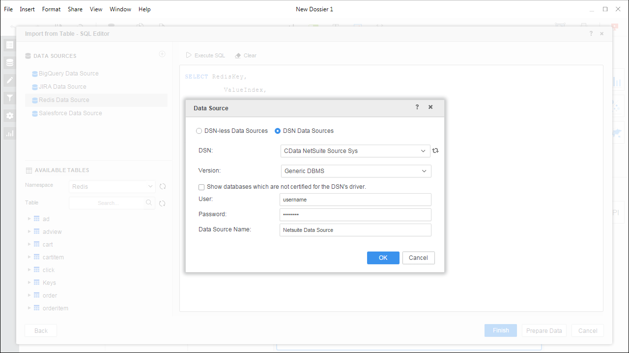 - Choose the DSN you previously configured (likely CData ExactOnline Sys) and select Generic DBMS in the Version menu.