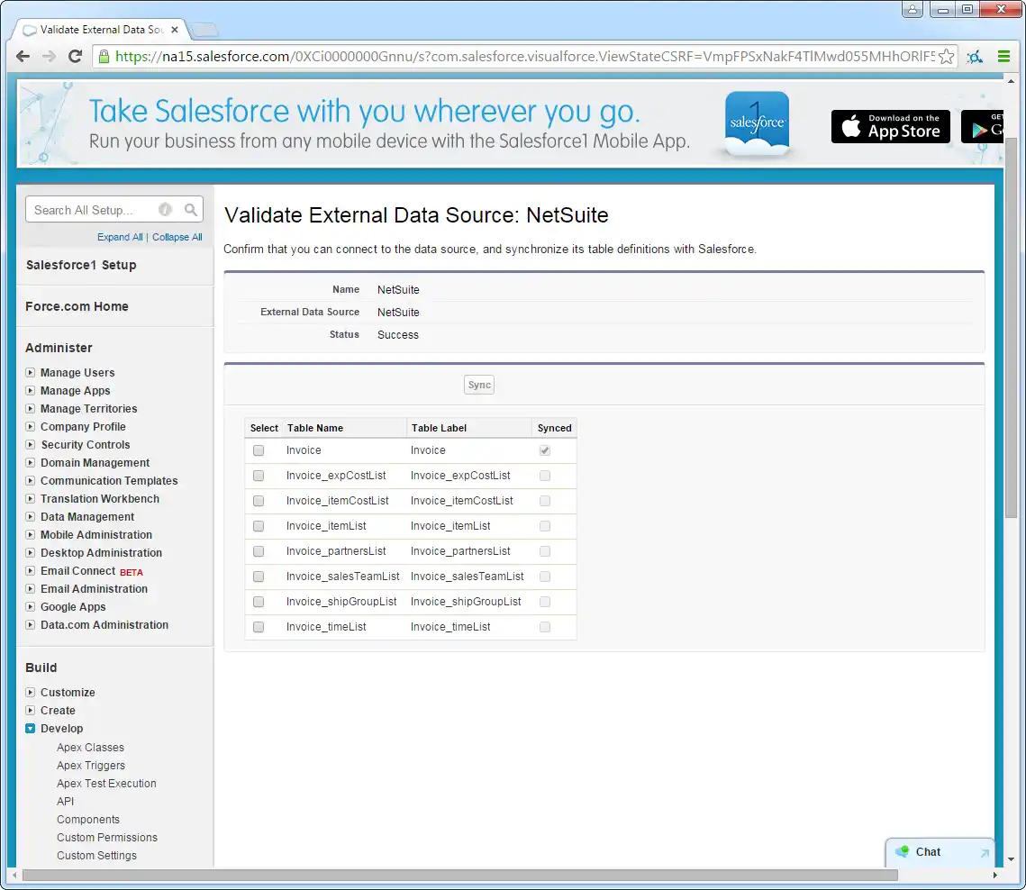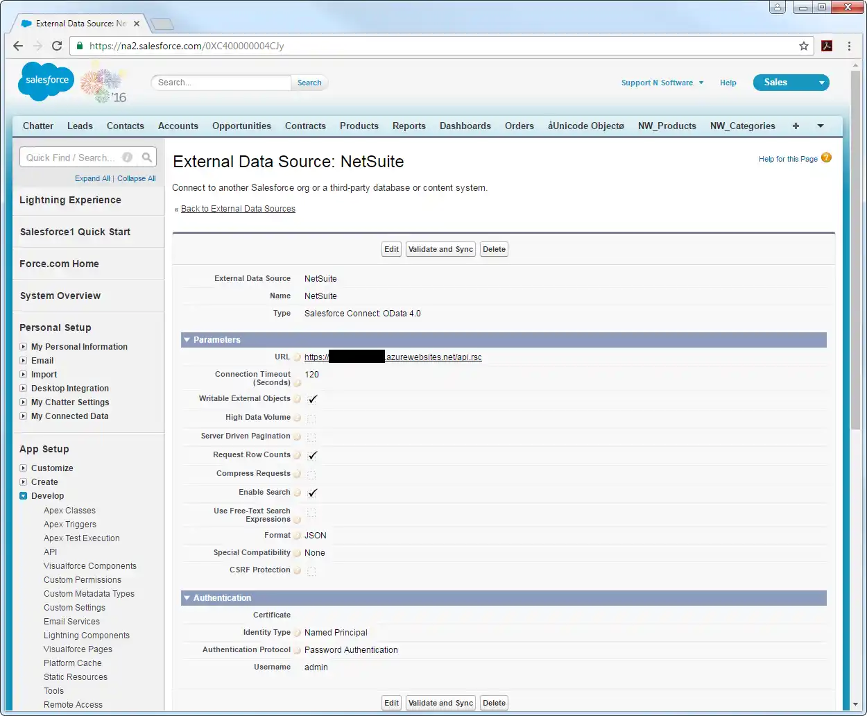 - Log into Salesforce and click Setup -> Develop -> External Data Sources.
