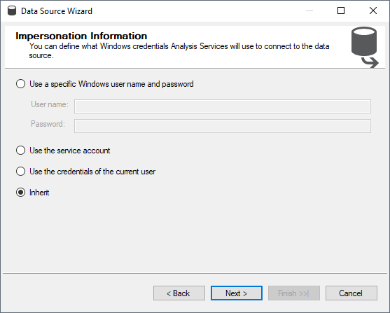 - Set the impersonation method to Inherit and click Next.