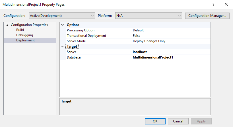 With the data source, data source view, and cube created, you are ready to deploy the cube to SSAS. To configure the target server and database, right-click the project and select properties. Navigate to deployment and configure the Server and Database properties in the Target section.