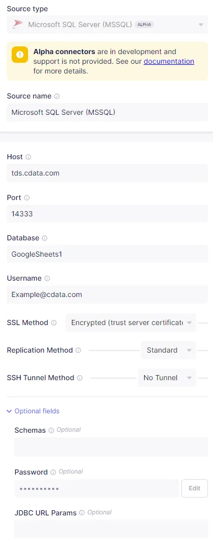 - Set Source Type to MSSQL Server to connect the TDS endpoint