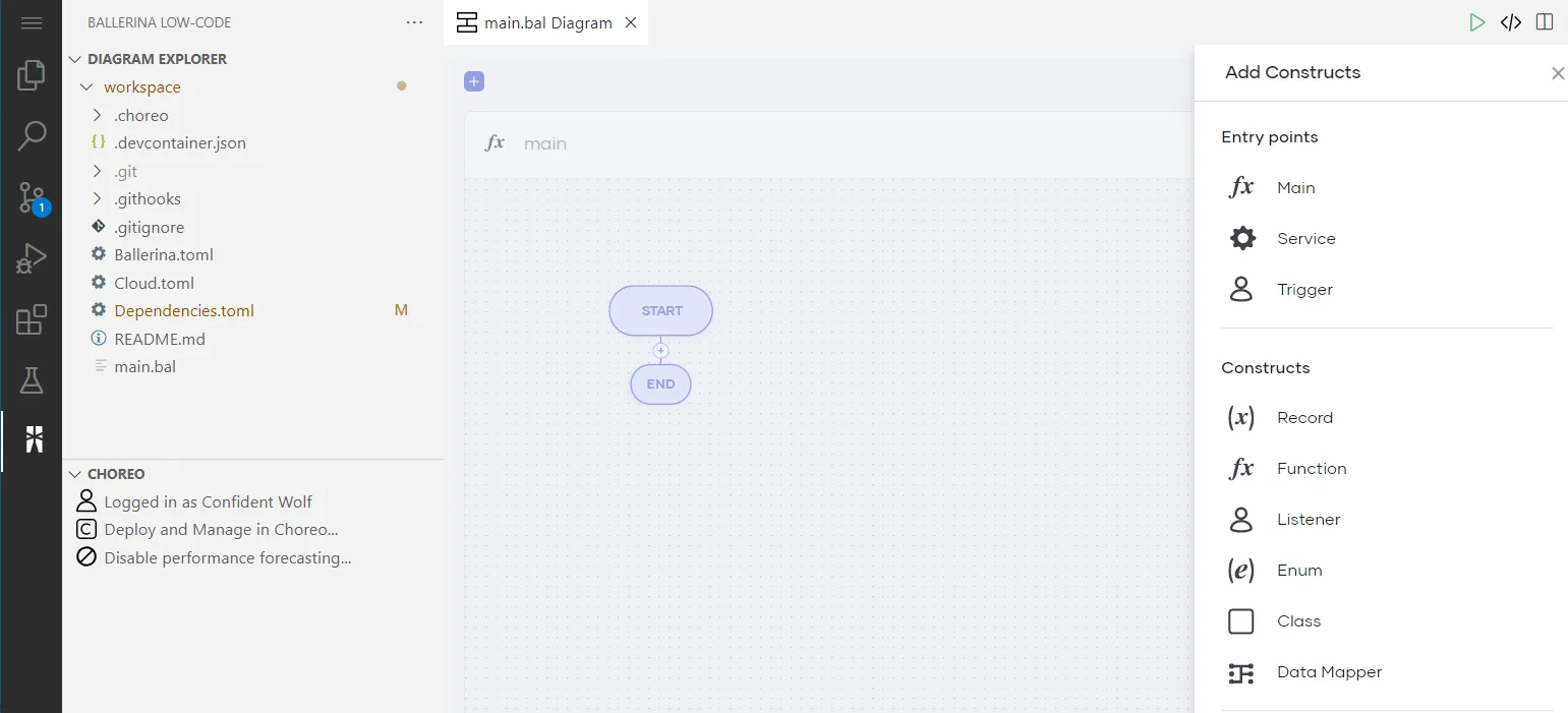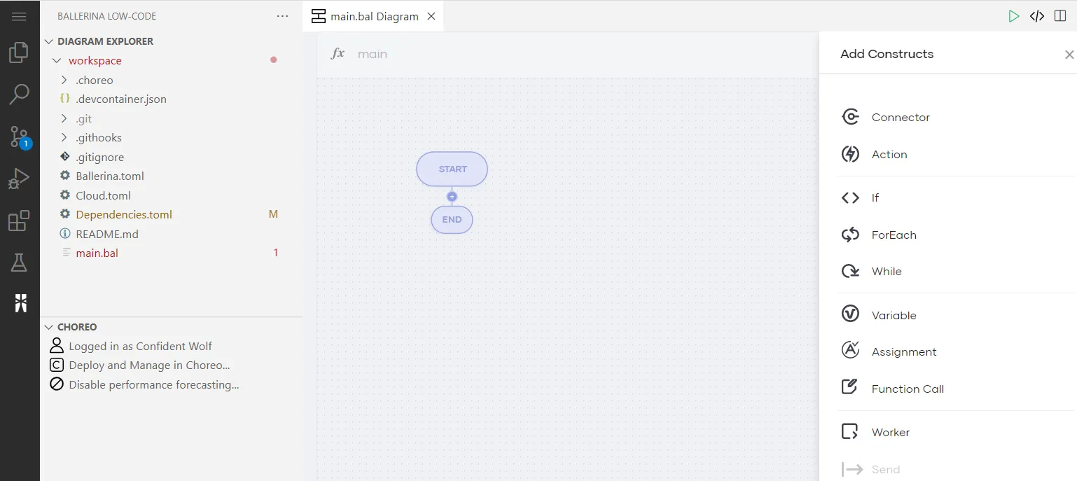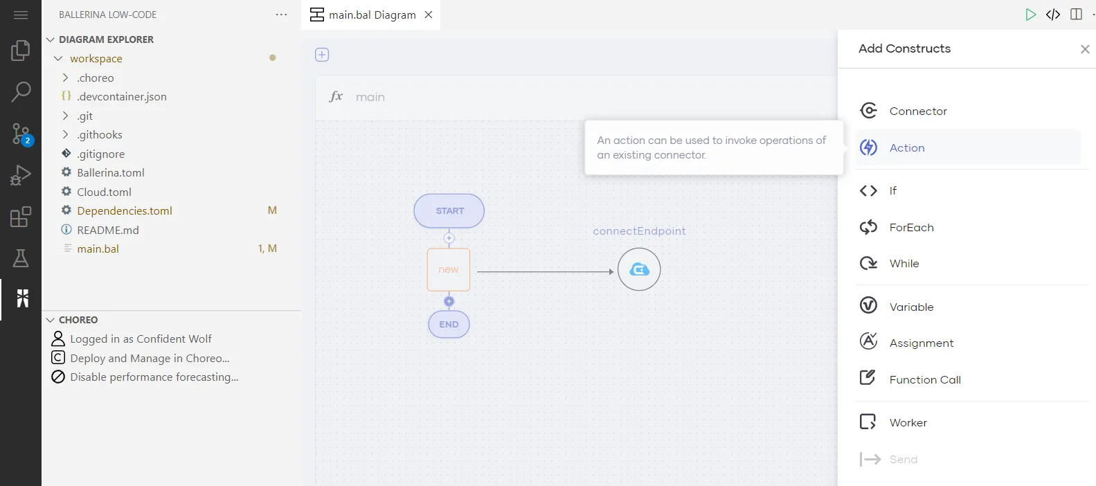 The Ballerina Low-Code IDE is displayed. Choreo automatically generates a construct in the low-code diagram