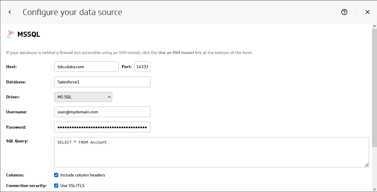 - Configure the data source by setting the MSSQL connection properties: