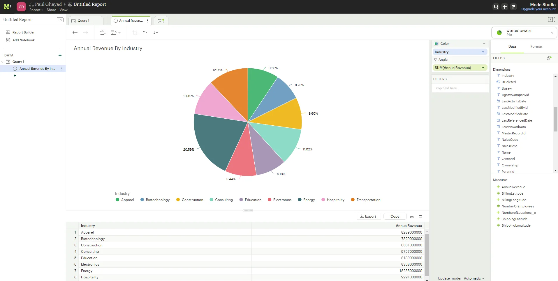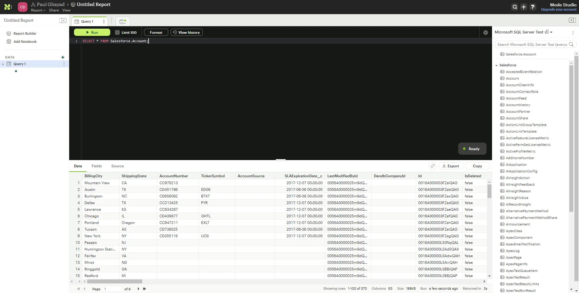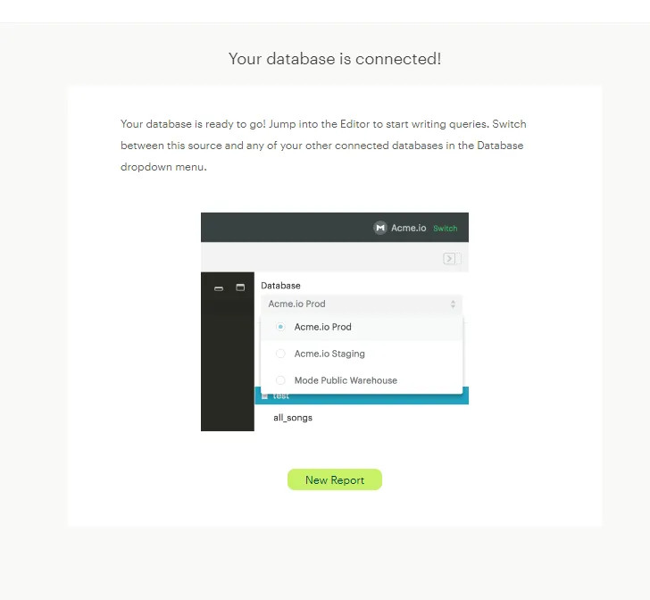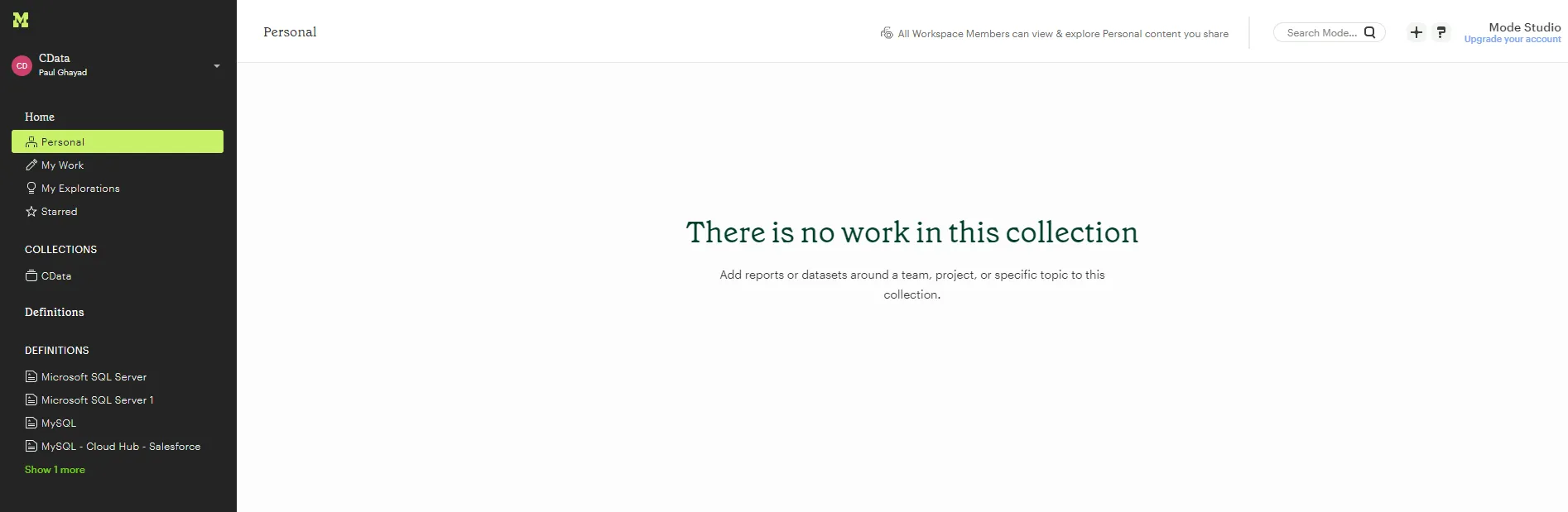 Your connection is now available for use in Mode. To connect to additional data sources from your CData Connect Cloud account, repeat the setup steps above, changing the value for Database for each data source.