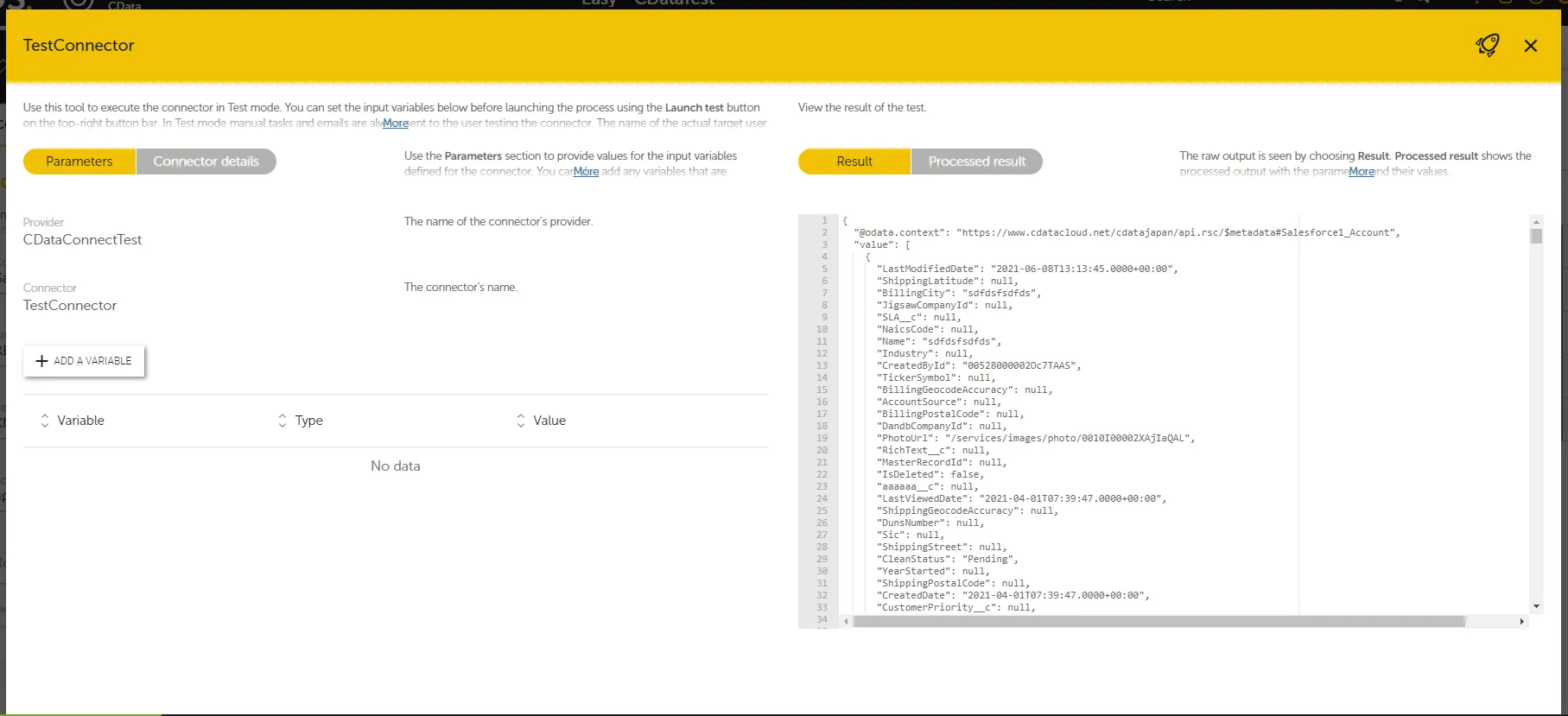 - Click Save then Launch to test the connector execution. Click Launch test to execute. The process is successful if you get the JSON response of your configured table information.
