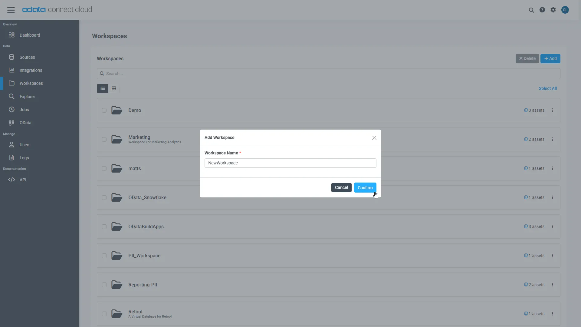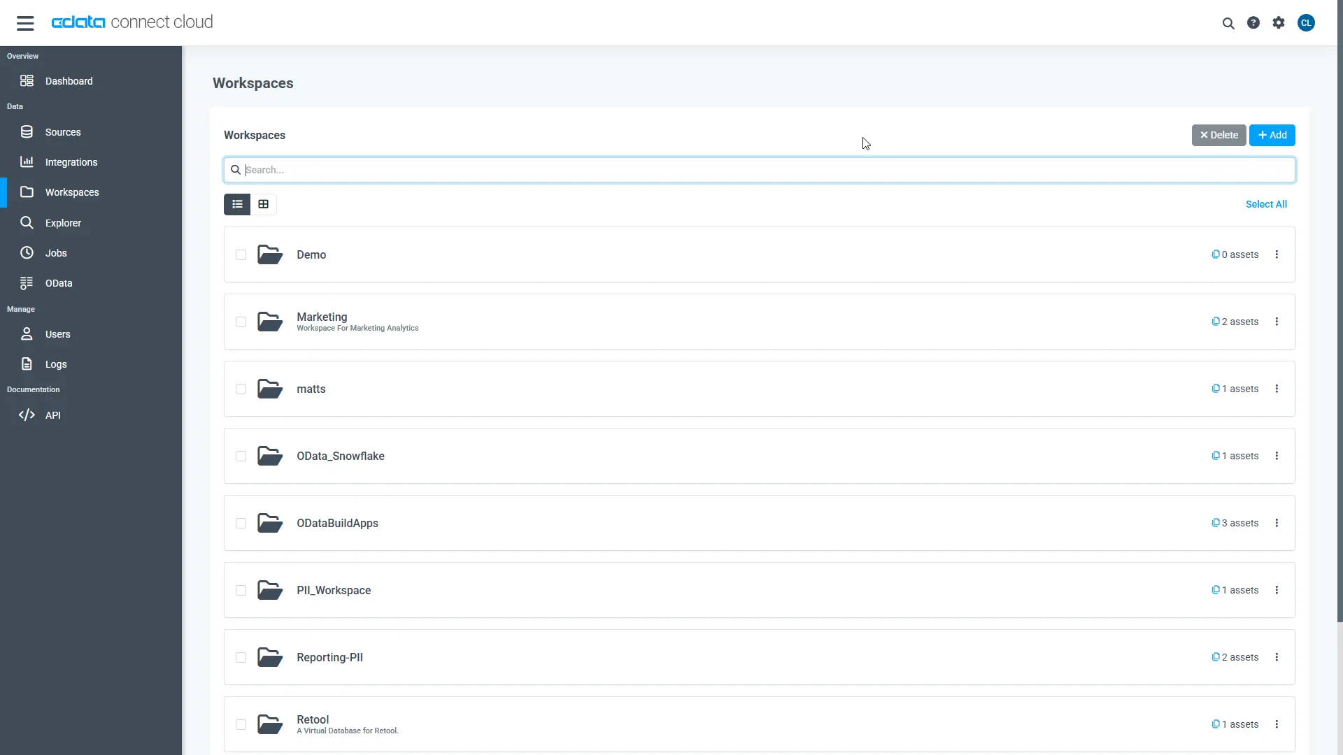 - Click Add to add new assets to the Workspace.