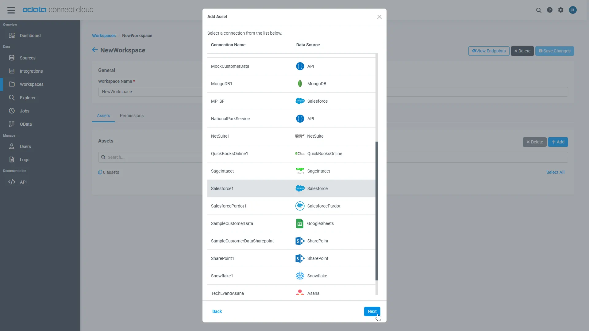 - URL: Set the OData endpoint in the Connect Cloud OData page: https://cloud.cdata.com/api/odata/{workspace_name}.