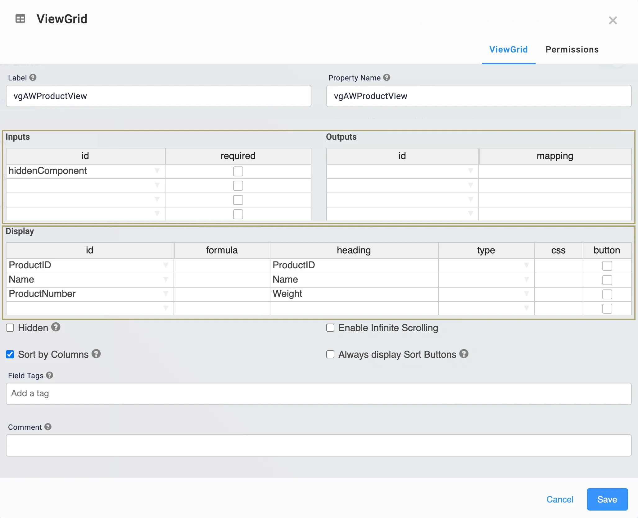 NOTE: You must use Camel Case (stylized as camelCase). For naming best practices, start your ViewGrid's Property Name with vg. For example, vgAWProductView.
